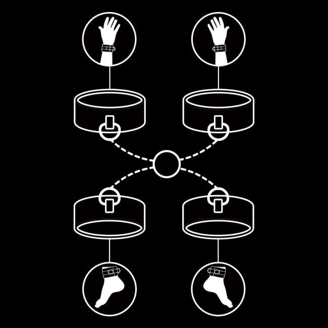 Van het merk Fetish Submissive komt een ingenieus setje pols en enkel boeien, die met een ring en kettingen met musketonsluitingen zorgt voor een perfecte hogtie-bondage. Het materiaal is zacht neopreen leer (ook wel vegan leather genoemd) en zeer gebruikersvriendelijk. Ideaal voor snelle bondages bij onderdanige mannen en vrouwen.